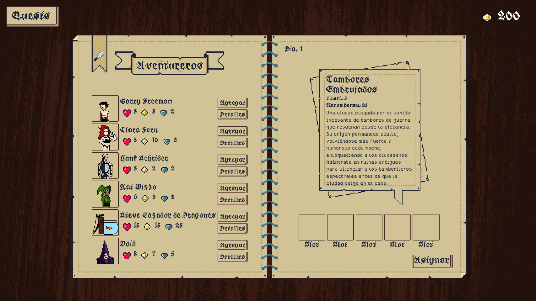Dungeon manager es un juego de administracion donde emvias a tu grupo de aventureros a completar misiones hasta que te quedes sin dinero